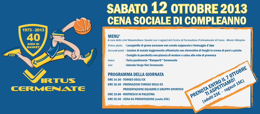 Il programma della giornata prevede, a partire dalle 14.30, il Torneo degli ex riservato a chi ha vestito almento una volta la maglia della prima squadra Virtus in una partita di campionato. La formula è quella del 3 contro 3, iscrizioni in palestra o via mail a info@virtuscermenate.it