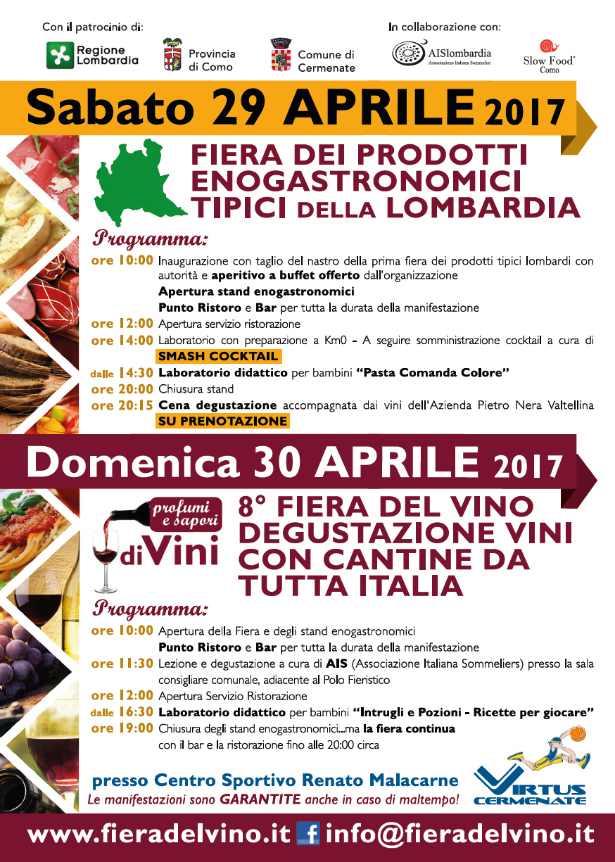 Proprio per questo nell’edizione di quest’anno abbiamo deciso di dedicare la giornata di sabato 29 aprile 2017 alla prima “Fiera dei prodotti enogastronomici tipici della Lombardia” dove verranno rappresentati solo i prodotti della Regione Lombardia, e sarà così un'ulteriore occasione per valorizzazione al meglio le eccellenze enogastronomiche italiane, focalizzando l’attenzione sui prodotti che caratterizzano il nostro territorio.