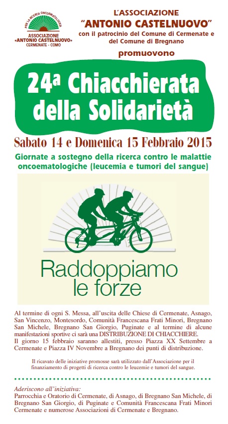 L'Associazione Antonio Castelnuovo, con sede in Cermenate, impegnata nella sensibilizzazione sui problemi legati alle malattie oncoematologiche, organizza la tradizionale "Chiacchierata della Solidarietà", giunta alla  24° edizione, con il patrocinio dei Comuni di Cermenate e Bregnano.
