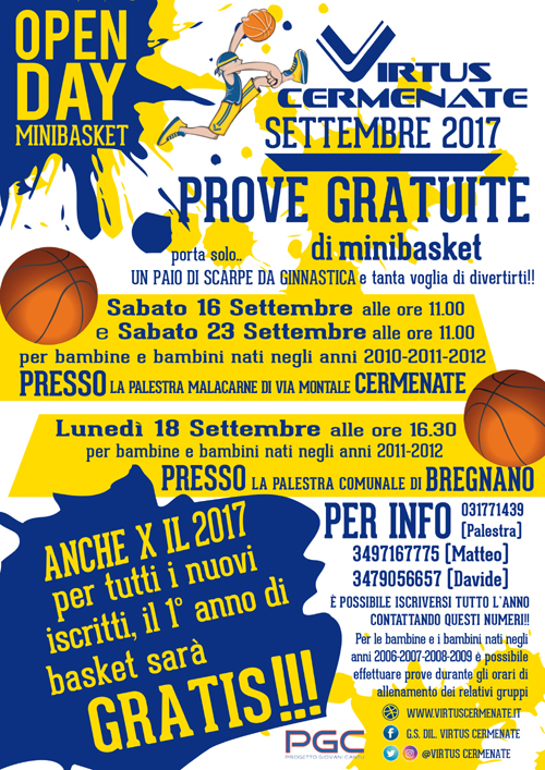 - sabato 16 settembre e sabato 23 settembre alle 11.00 per bambine e bambini nati negli anni 2010-2011-2012 presso la Palestra Malacarne di via Montale, 1 - Cermenate