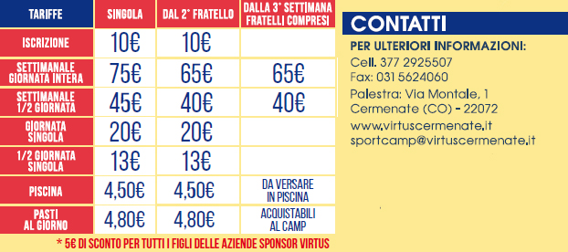 E' possibile iscriversi ad una o più settimane o anche a singole giornate; sono previsti sconti dalla terza settimana in poi e per i figli di dipendenti di aziende sponsor della Virtus.