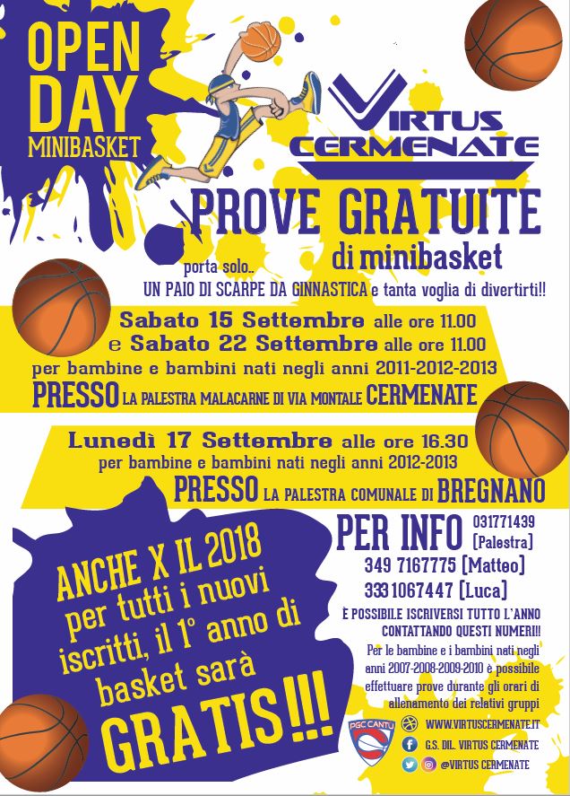 - sabato 15 settembre e sabato 22 settembre alle 11.00 per bambine e bambini nati negli anni 2011-2012-2013 presso la Palestra Malacarne di via Montale, 1 - Cermenate
