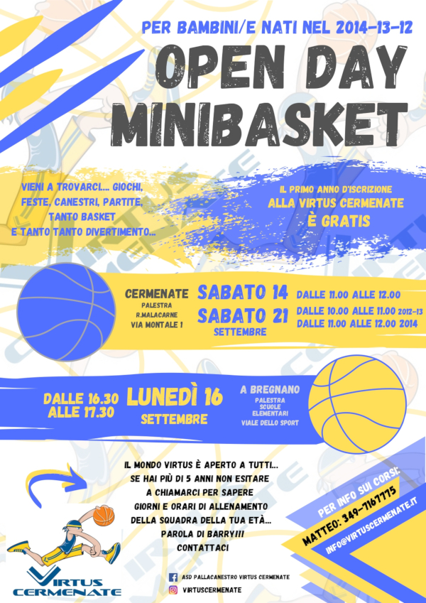 - sabato 15 settembre e sabato 22 settembre alle 11.00 per bambine e bambini nati negli anni 2011-2012-2013 presso la Palestra Malacarne di via Montale, 1 - Cermenate