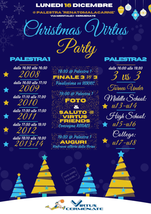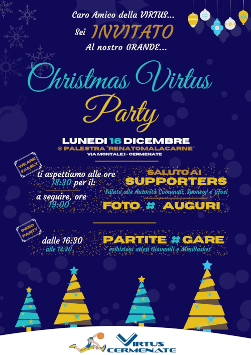 Lunedì 16 dicembre dalle ore 16.30 alla palestra Malacarne si terrà la tradizionale festa di Natale della Virtus.