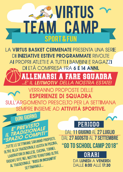 Dopo il successo delle scorse estati...a partire dal 11 giugno 2018 prende il via la nuova edizione di TEAM CAMP – Sport & Fun, iniziativa promossa dalla Virtus Pallacanestro.