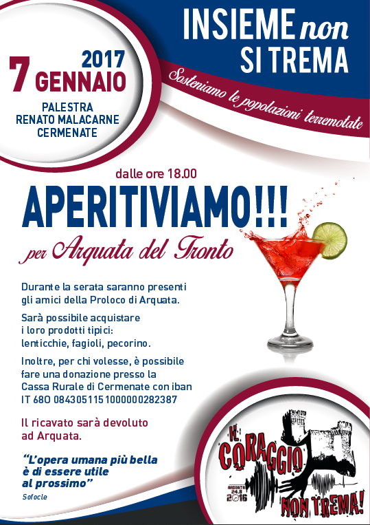 Sabato 07 gennaio a partire dalle 18.00, presso la palestra Malacarne, è in programma un aperitivo organizzato da Insieme non si trema.