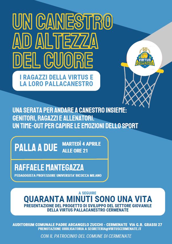 Martedì 04 aprile alle 21:00 presso l’Auditorium Comunale Padre Arcangelo di Cermenate abbiamo organizzato un incontro pensato per mettere in dialogo i nostri atleti, i loro genitori e i loro allenatori sul tema dell’importanza dello sport e del suo valore pedagogico.