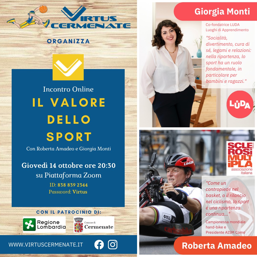 La Virtus Cermenate, con il patrocinio di Regione Lombardia e del Comune di Cermenate, organizza un incontro online sul tema "Il valore dello sport", in data Giovedì 14 Ottobre 2021 alle ore 20:30.